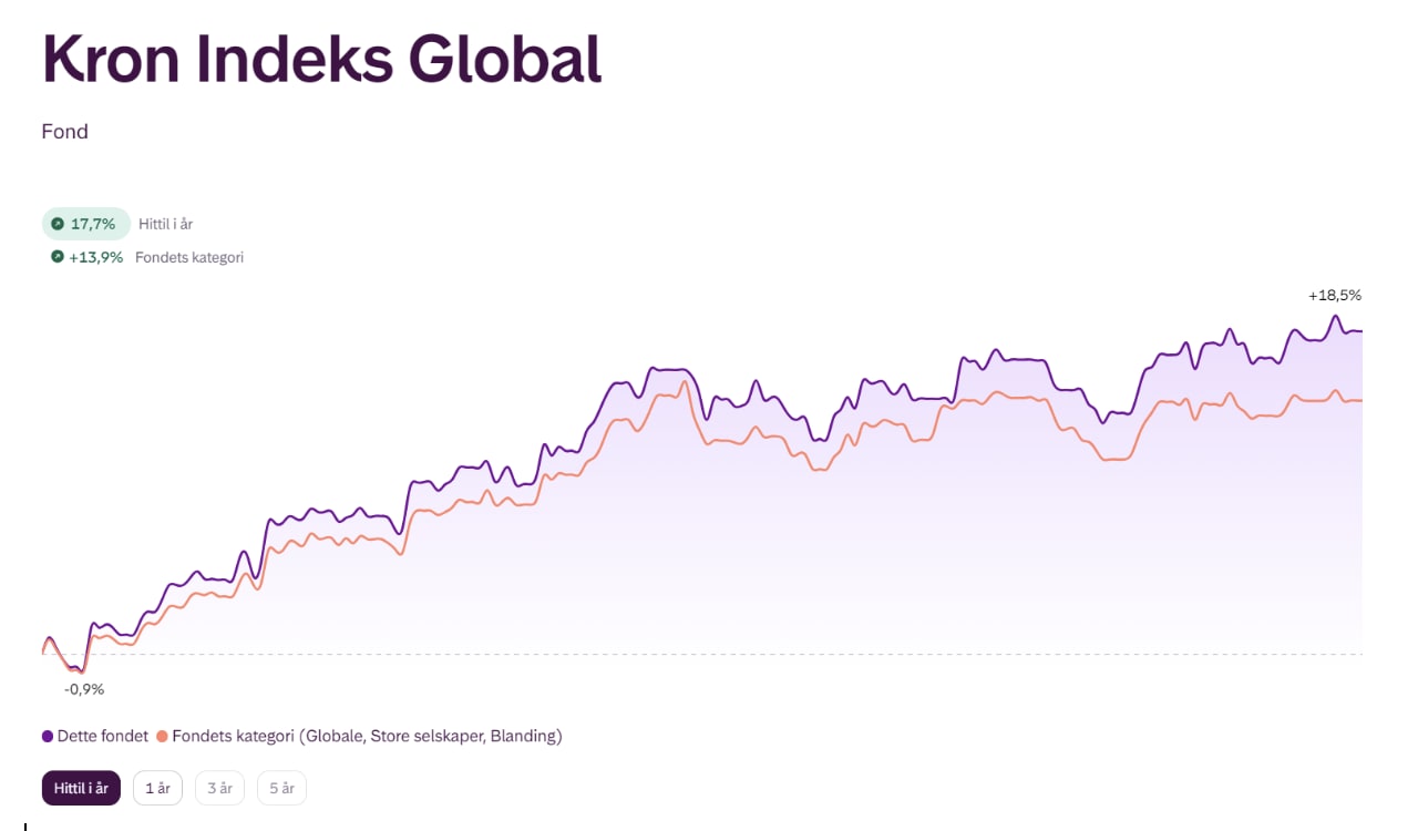Når du er inne og ser på et fond på Kron.no vises både utviklingen til fondet, og i tillegg utviklingen til det vi kaller «fondets kategori». «Fondets kategori» er en Morningstar-kategori satt sammen av dataleverandøren Morningstar . Hvilken kategori et fond tilhører, blir bestemt på bakgrunn av fondets investeringsstil, i tillegg til hvilke beholdninger fondet eier og statistikk fra de siste tre årene.